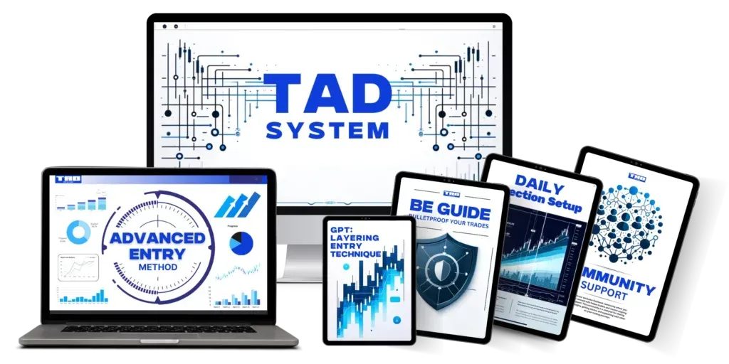 The TAD System is a set of comprehensive Forex trading strategies that helps traders achieve up to a 10% increase in their account balance daily, with trading win-rate up to 95%. It includes unique methods such as the Advanced Entry Method (AEM) and TAD Recovery Method (RM) to optimize entries and manage risks.
